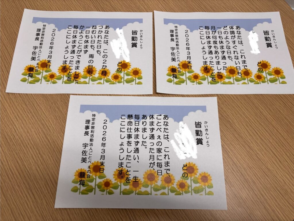 毎日出勤の皆勤ではなくても、皆さんそれぞれ決めた日にち、来れるときに来て下さること、それも十分皆勤賞だと思っていることは、付け加えておきたいと思います。